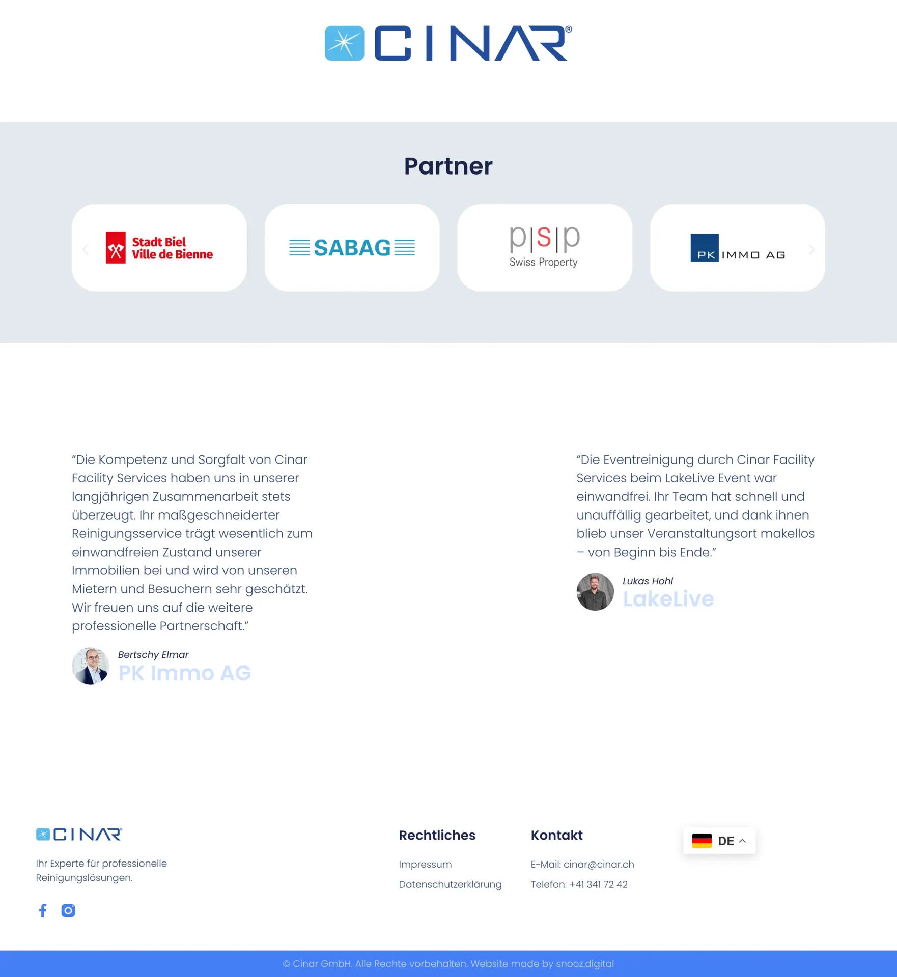Das Ergebnis ist eine übersichtliche und ansprechende Webseite, die die langjährige Erfahrung, die führende Marktposition in der Region Seeland/Jura und die starken Kundenbeziehungen von Cinar Facility Management effektiv hervorhebt. Die Website dient als digitales Schaufenster, das die Firmenidentität widerspiegelt und potenzielle Kunden zur Kontaktaufnahme ermutigt.